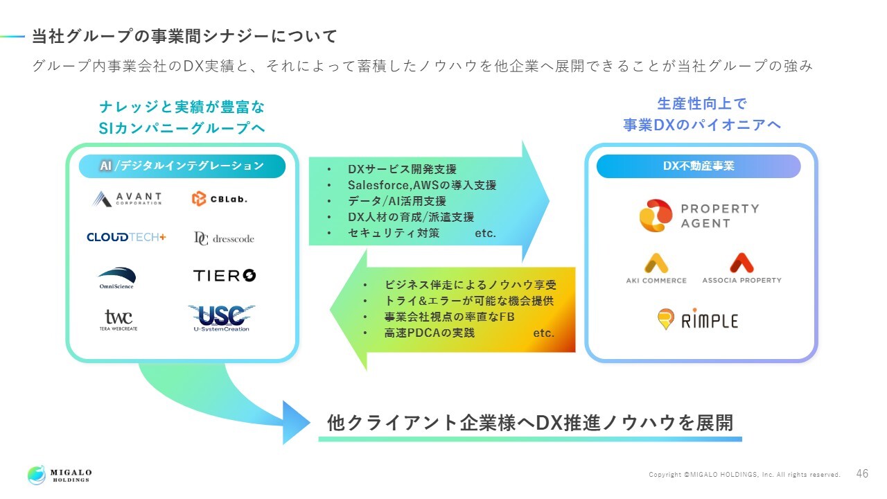デジタルインテグレーションに関しては、さまざまな開発ノウハウ・ソリューションを有しています。プロパティエージェント社に生産性を高めるためのITの導入やDXソリューションを提供し、それがデジタルインテグレーションへの横展開につながるシナジー効果を持っています。