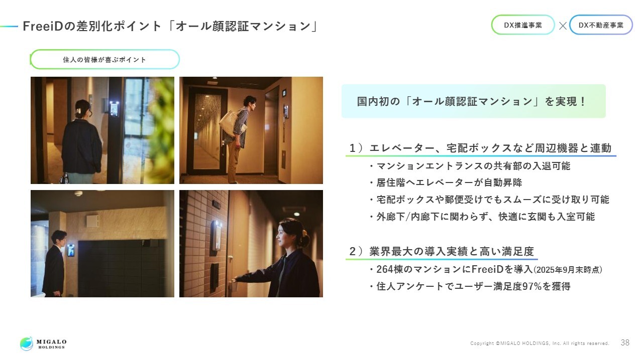 当社の強みの1つは、当社が開発する投資用の新築1Kタイプおよび1DKタイプのマンション、さらに居住用の1LDKタイプのマンションにはすべて顔認証が導入され、鍵が一切いらない「オール顔認証マンション」だということです。