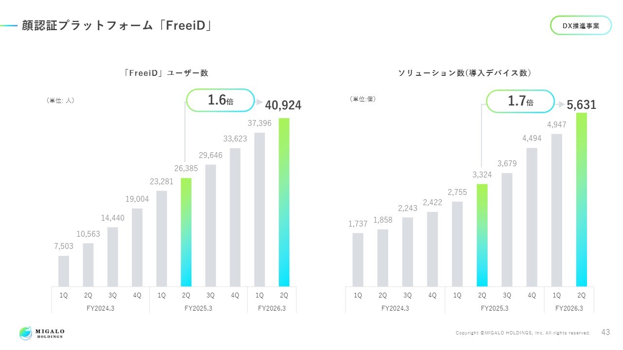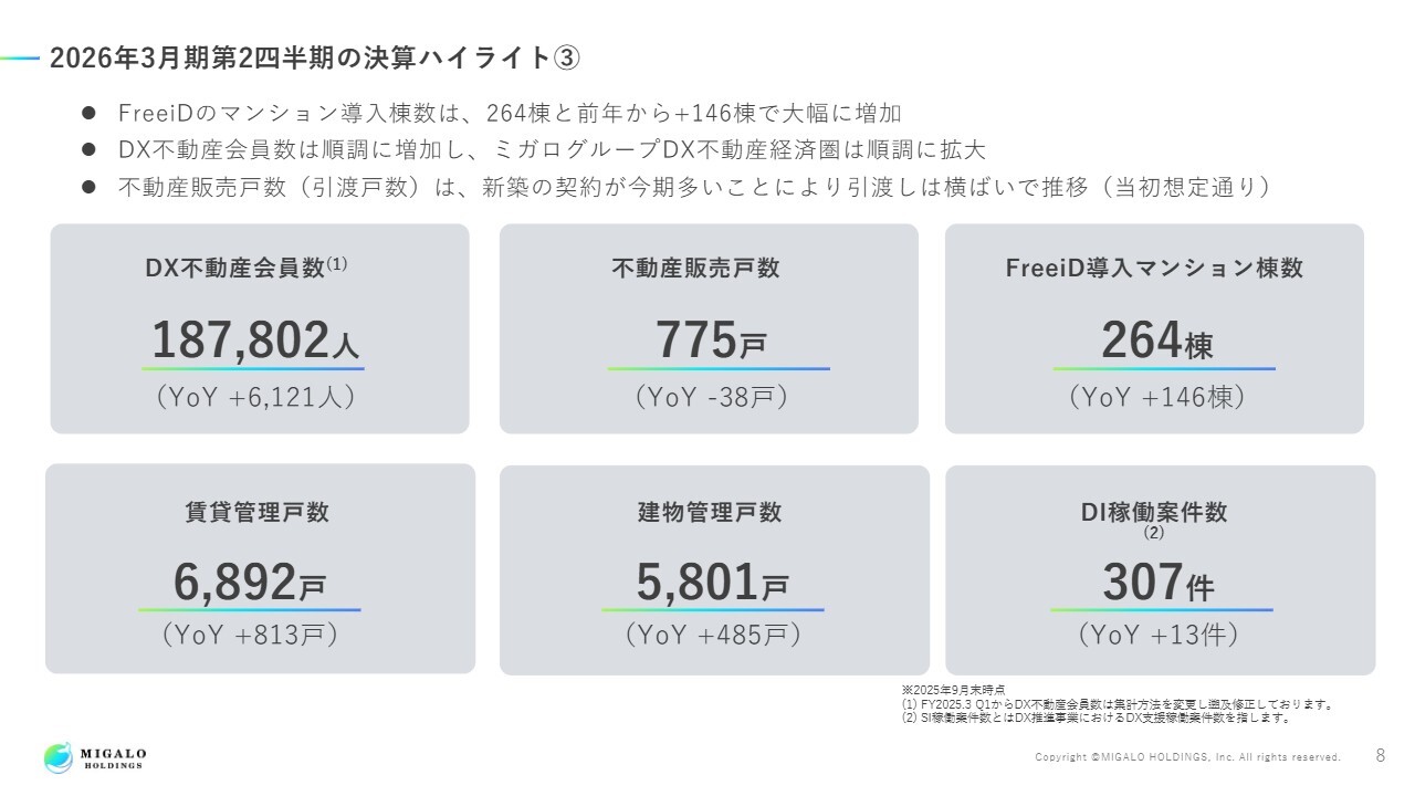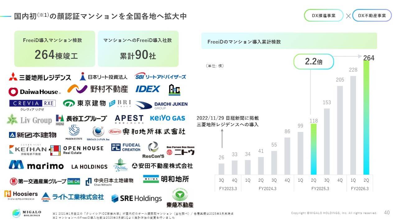 「FreeiD」のマンション導入棟数は前年同期比で146棟増加し、約2倍となる264棟に達しました。また、ストック収益である賃貸管理戸数や建物管理戸数が順調に拡大しており、デジタルインテグレーションの稼働案件数も着実に伸びています。