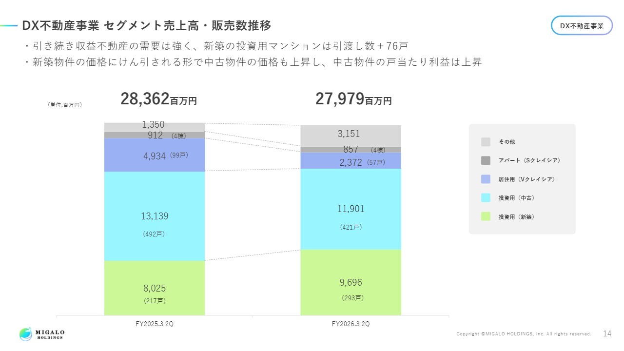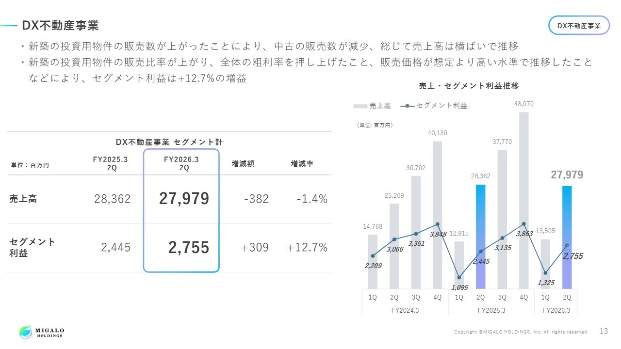 DX不動産事業に関しては、新築の販売ポートフォリオが高まった上で、売上高は総じて横ばいとなりました。一方、新築のポートフォリオが増えたことと販売価格が想定より高い水準で推移したことにより、セグメント利益は前年比で12.7パーセントの増益となりました。
