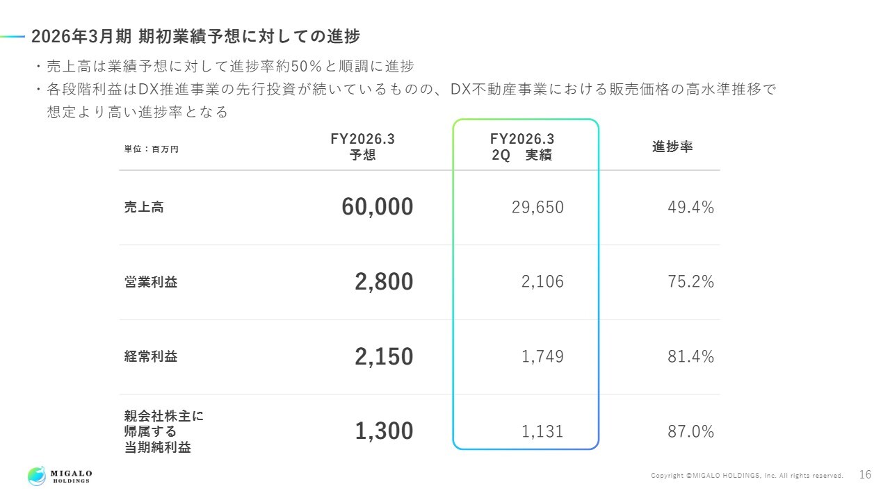 売上高はちょうど半分程度ですが、営業利益・経常利益・当期純利益は良好な進捗を示しています。