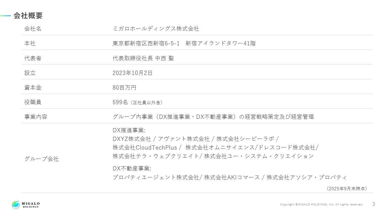 会社概要です。役職員は約600名で、ミガロホールディングスは2023年10月に設立されました。本社は西新宿にあります。