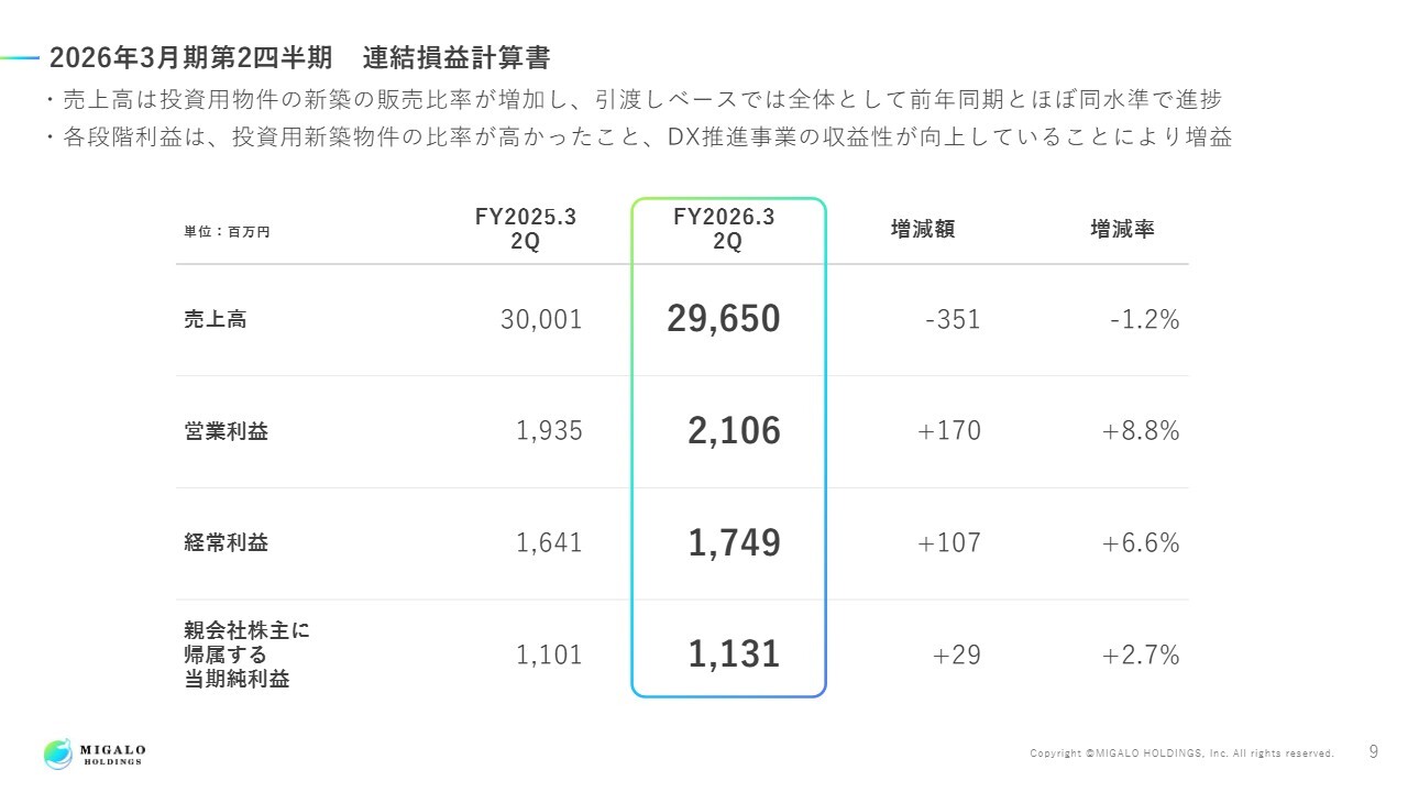 売上高は前年比マイナス1.2パーセントとなりました。営業利益、経常利益、親会社株主に帰属する当期純利益は前期比約2パーセントから約8パーセント増加しています。この結果は、前年同期に比べ新築マンションの販売・引渡し戸数が増加したことにより全体として粗利率が高くなり、また、賃料の上昇を背景に中古マンションの販売単価上昇が寄与したためです。