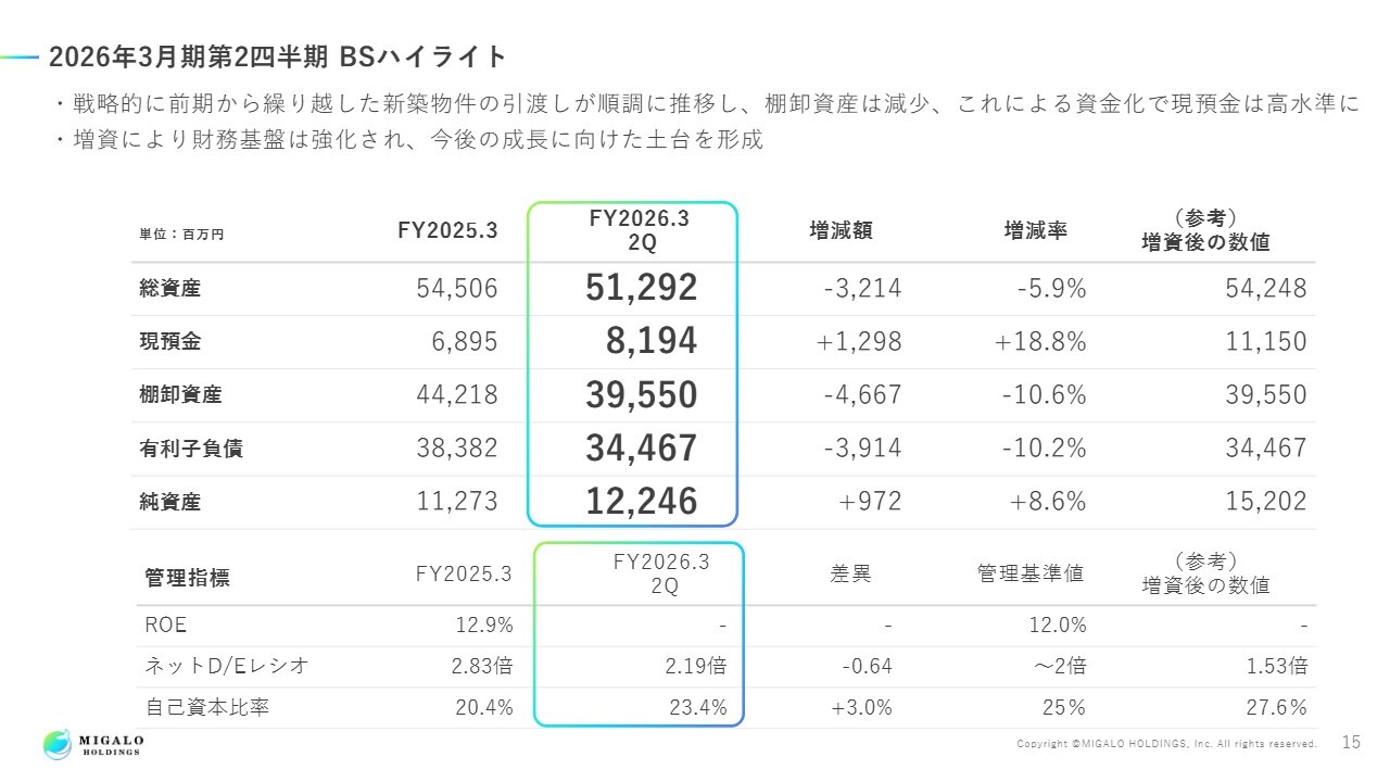 参考ですが、増資後の数値はネットD/Eレシオが1.53倍、自己資本比率が27.6パーセントとなっています。