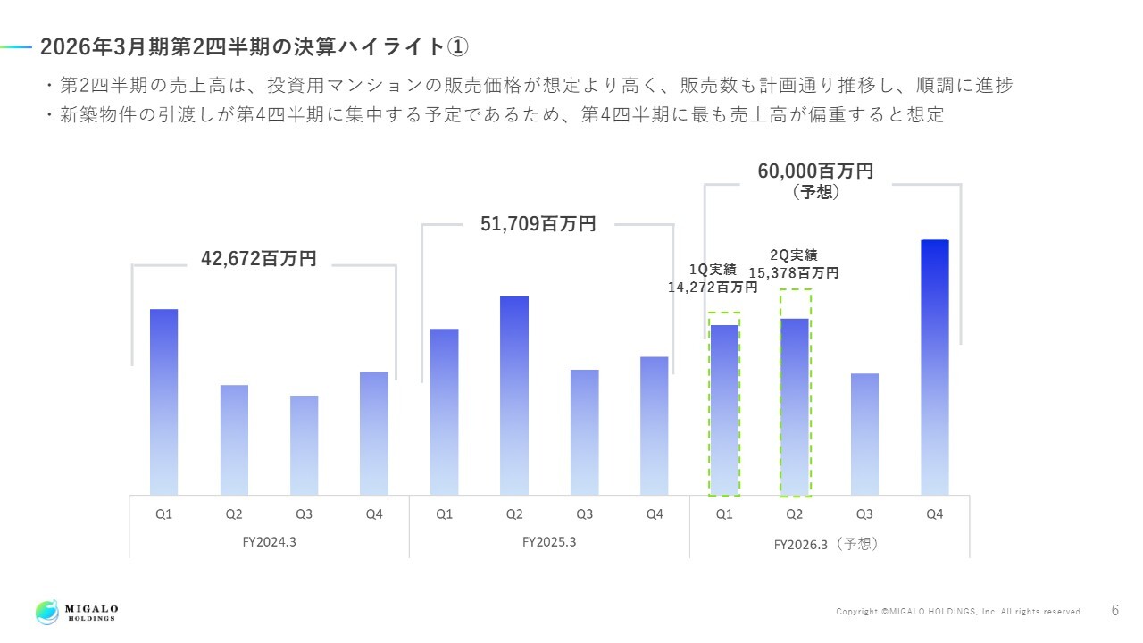 今期は、新築物件の決済が第4四半期に集中することから、ミドル、ロー、ハイというかたちで推移を表していましたが、現時点では、第1四半期と第2四半期ともに若干の上振れが見られました。