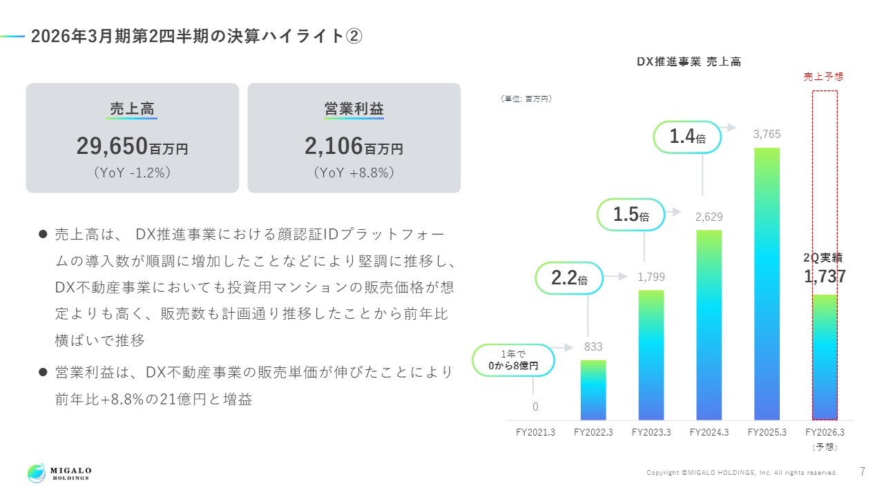 第2四半期決算のハイライトです。DX推進事業における顔認証IDプラットフォーム「FreeiD」の導入が伸びており、DX支援のシステム開発も順調に進捗しています。赤い点線は通期の売上予想を表しています。