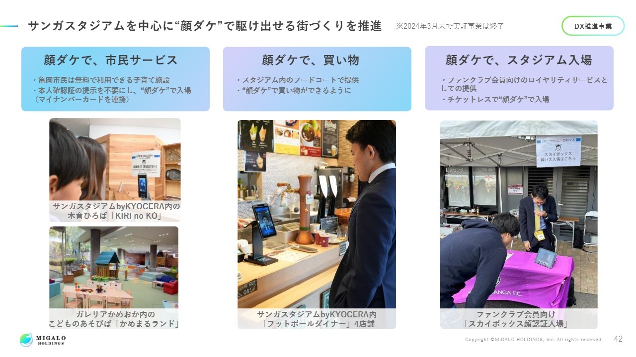 当社は、オフィスやマンションなどに顔認証を導入するだけではなく、1つの顔画像で異なる顔認証エンジンを使用し、駅、タクシー、マンション、オフィス、ショッピングなど、さまざまな場面で活用できるような仕組みを目指したところ、サンガスタジアムをはじめ北海道上川町やイオンモール常滑でも実証事業が実現しました。