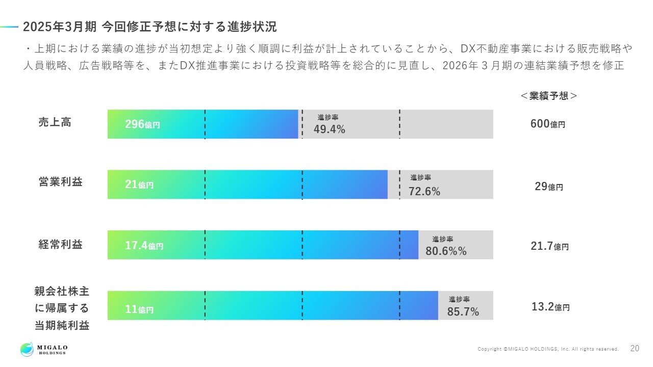 修正予想に対する進捗状況ですが、営業利益は72.6パーセント、経常利益は80.6パーセント、当期純利益は85.7パーセントとなっています。