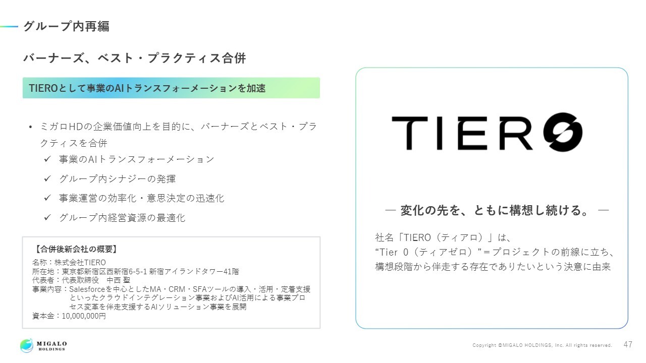 TIERO社は、システム開発業界は「多重下請け構造」と言われることがあるなか、「Tier 0」、つまりお客さまの要件定義からではなく、DX化やAIによる生産性向上を目指す会社が今後大幅に増えていく見込みですので、そうした会社において、「Tier 1」ではなく「Tier 0」のようにプロジェクトの前線で構想段階から伴走する存在となることを目指しています。