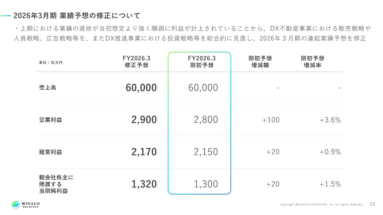 2026年3月期の業績予想と配当の修正についてお伝えします。第1四半期および第2四半期において、当社の想定を少し上回る結果が見られたこと、またDX不動産事業において販売価格が想定以上に伸びていることから、営業利益を1億円上方修正しました。