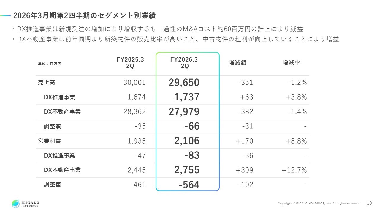 セグメント別の業績です。売上高がDX推進事業で前年比3.8パーセントの増加、DX不動産事業では前年比1.4パーセントの減少となっています。