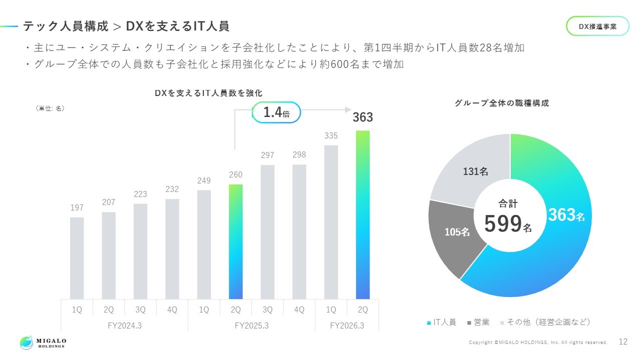 テック人員構成ですが、今回、ユー・システム・クリエイション社が仲間に加わったことで、28名増加し、IT人員は363名となりました。