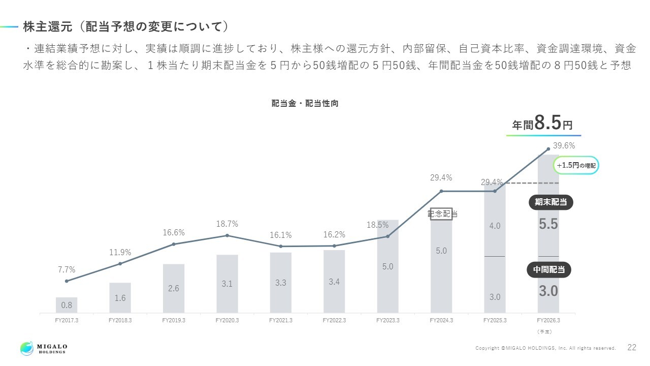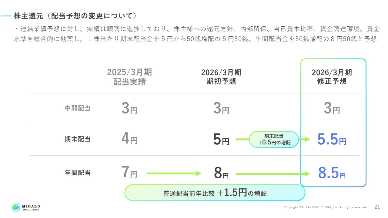 今回、中間配当は3円、期末配当は0.5円(50銭)増配して5.5円、年間配当は8.5円とする予想に変更しました。