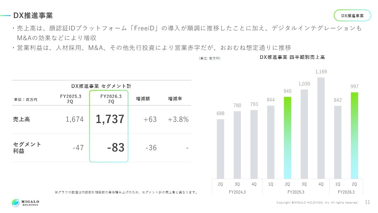 DX推進事業に関しては、売上高は新規受注の増加により前年比3.8パーセント増収となっています。また、セグメント利益はマイナス8,300万円となっており、これは一過性のM&Aコスト約6000万円の計上を含んでいます。一過性のコスト計上を除けば収益性の向上により、赤字は縮小しています。