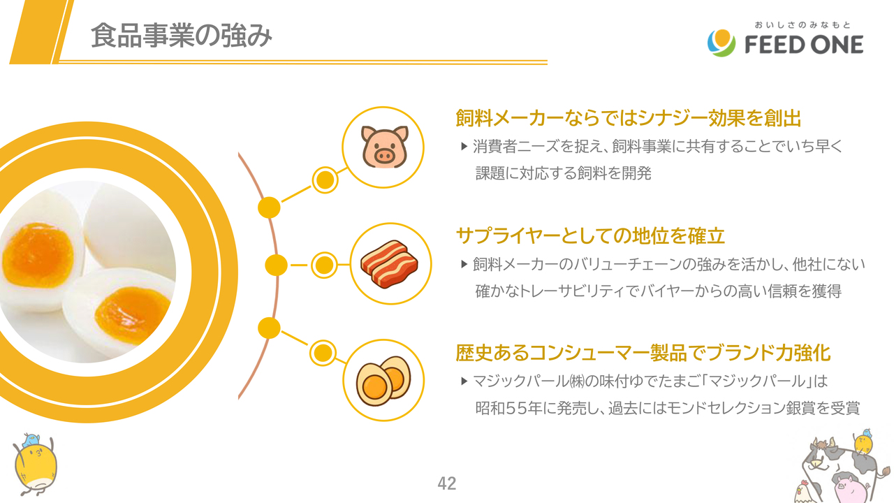 当社の食品事業の強みは、飼料会社ならではのシナジー効果、数多くの大手量販・大手外食へのサプライヤーとしての地位確立、そして、子会社であるマジックパール株式会社での当社グループを代表するコンシューマー商品「マジックパール」の製造・販売です。