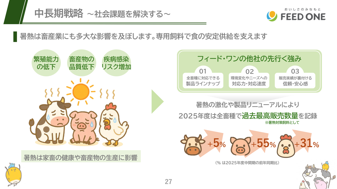 例えば人間であれば暑いときは辛いものを食べて食欲増進を図るなどしていますが、当社はそれぞれの畜種にあった暑熱対策飼料の開発に取り組んでおり、今年は特に猛暑であったこともあり、全畜種で暑熱対策飼料の販売数量を大きく伸ばすことができました。