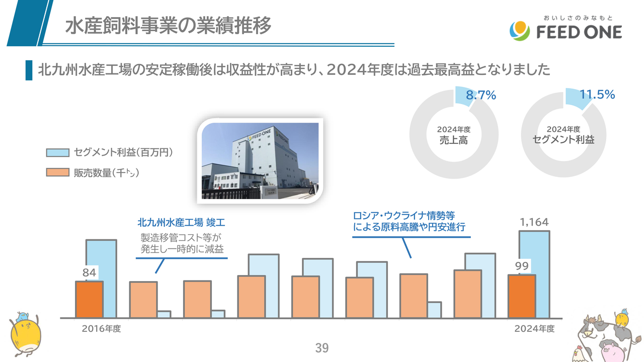 最後に水産飼料の販売数量・セグメント利益の実績推移です。近年、先ほどご説明させていただいた取り組みの成果が出つつあり、セグメント利益は増加し、今年度も過去最高益の更新を見据えています。