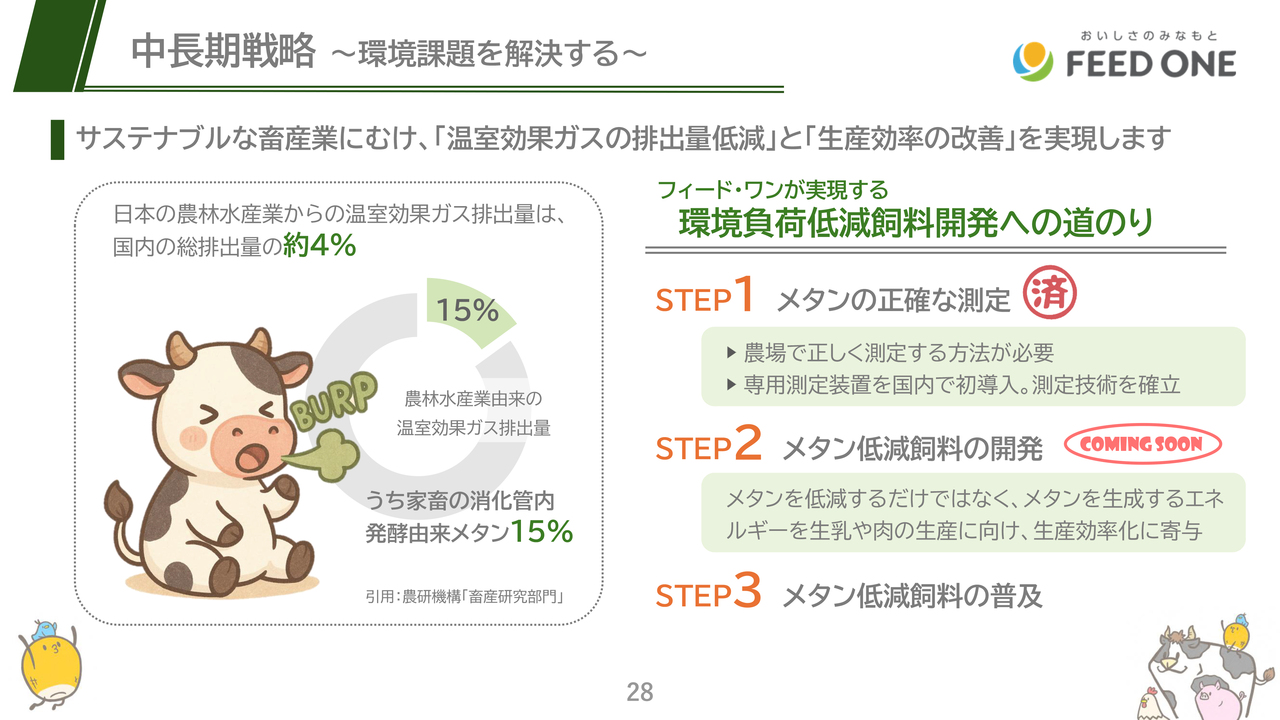 当社は、メタン生成に使われるエネルギーを牛の成長へ有効活用する技術の研究を進め、近々、製品としての発売を考えています。