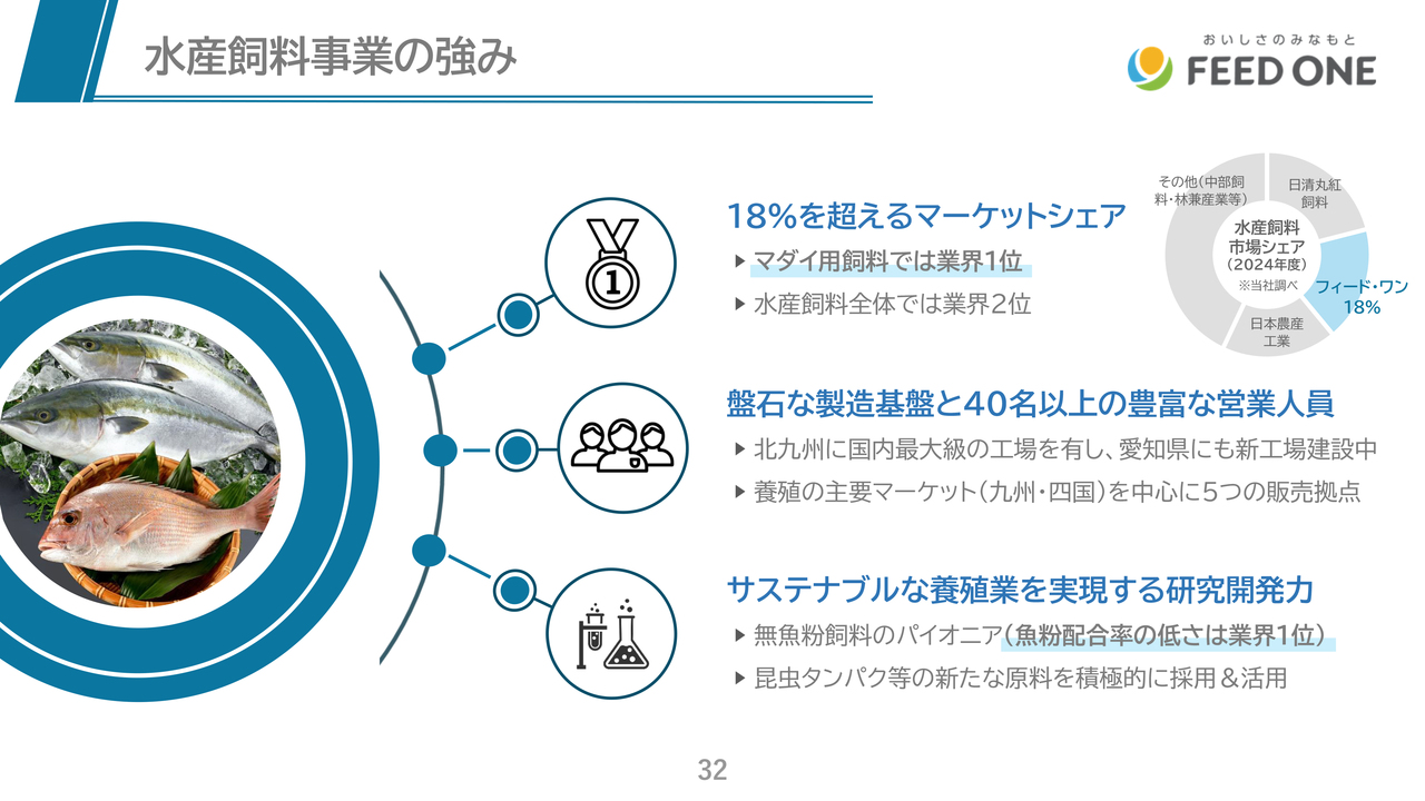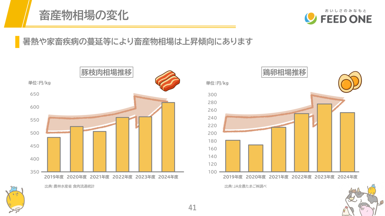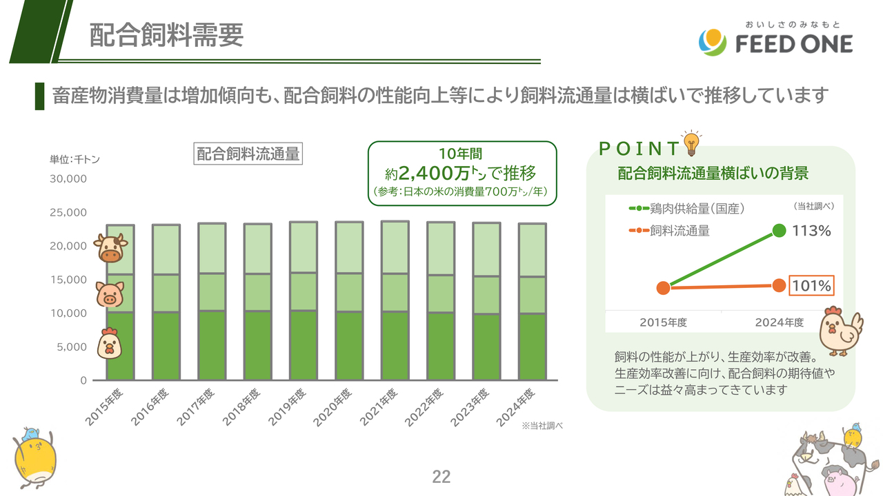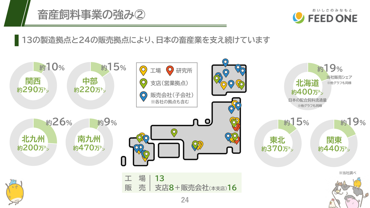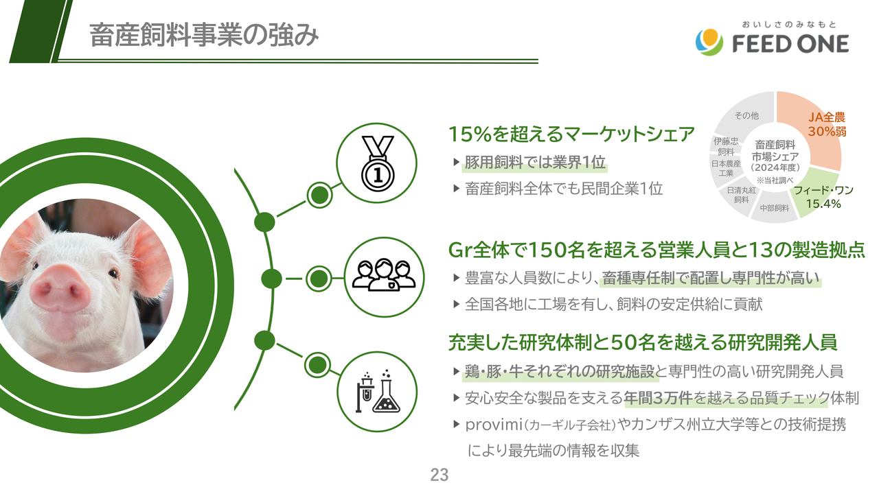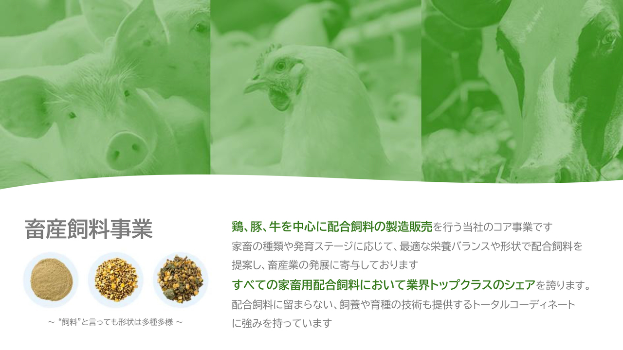 また、工場も全国13ヶ所に設置しており、物流費が高騰する中、家畜が日々食べる配合飼料を適切な価格で安定供給できる体制となっている点も強みです。