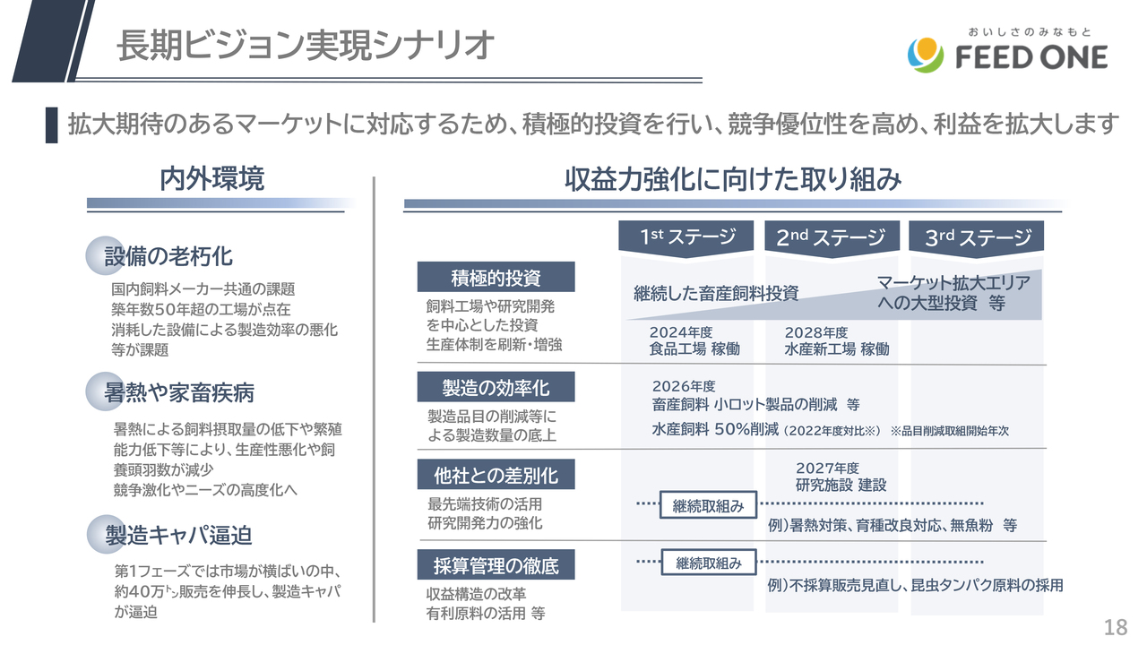 あわせて、飼料工場へのリニューアル投資を重ねながら、来る大型投資に備えた準備をしていきます。