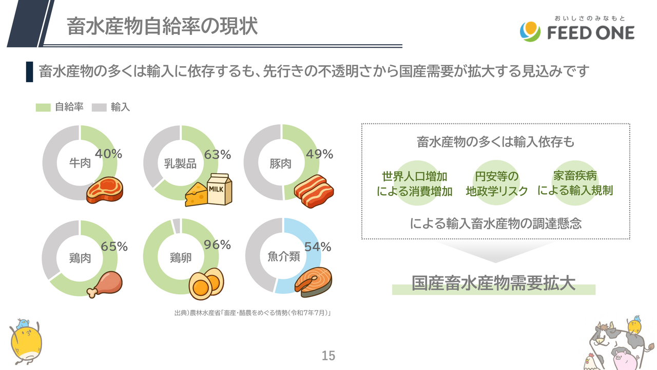 世界人口の増加や、円安・紛争等の地政学リスク、世界各国で発生している家畜疾病の影響、さまざまな要因により輸入が滞るリスクがあり、国産畜水産物の需要拡大が見込まれます。