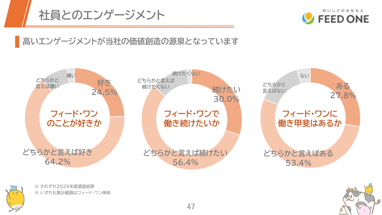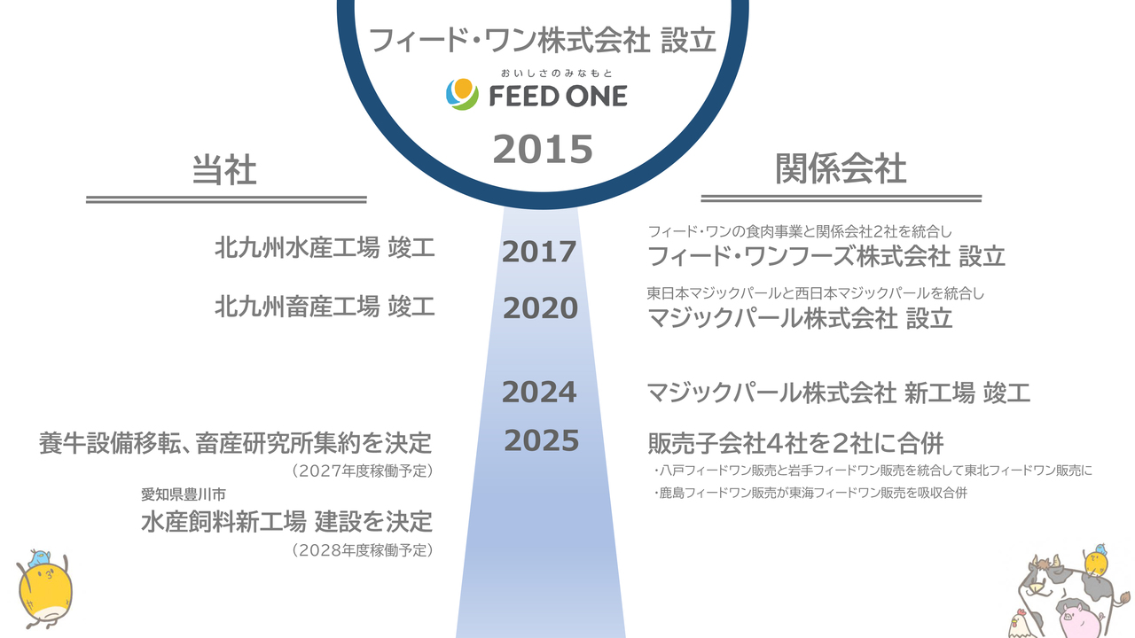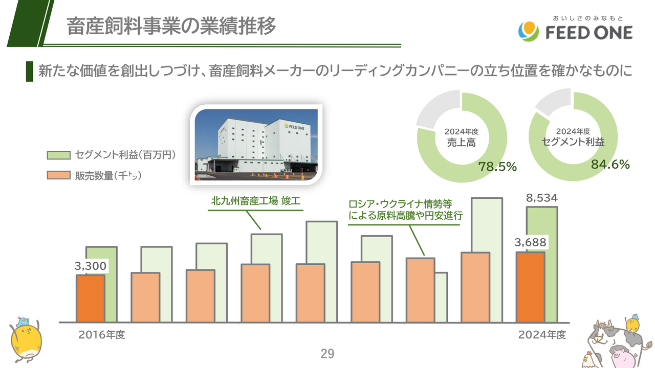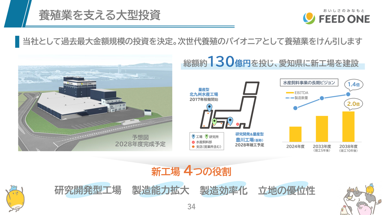 昨年度は、食品子会社であるマジックパール株式会社の新工場を竣工し、今年度は養牛用研究施設を10億円超かけ移転することを決議するとともに、新しい水産飼料工場を総工費約130億円かけ、愛知県豊川市に建設することも決議しています。