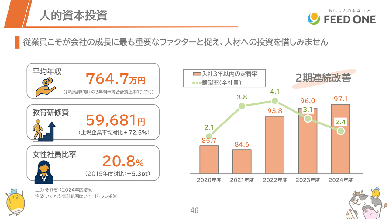人的資本投資の結果、新入社員の3年定着率も97パーセントを超え、全社員ベースでの離職率も2.4パーセントとかなり低い数字となっています。
