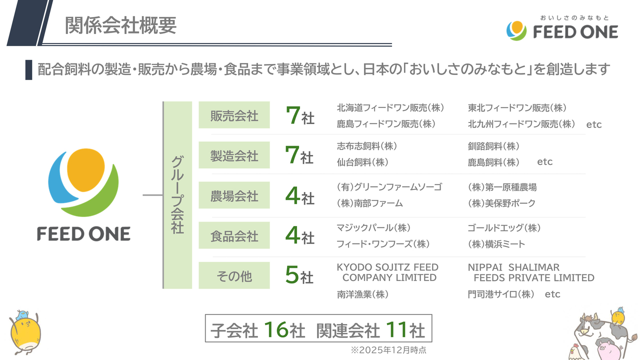 配合飼料の販売会社・製造会社、鶏と豚の農場、卵と豚肉の食品会社、海外はベトナム、インドに進出しており、連結子会社16社、関連会社11社、合計27社のグループ会社で構成されています。