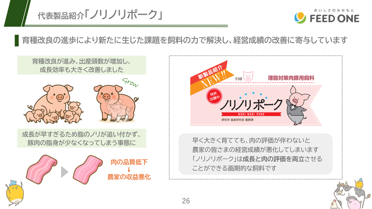 豚向け配合飼料では2023年に「ノリノリポーク」という新製品をリリースしました。