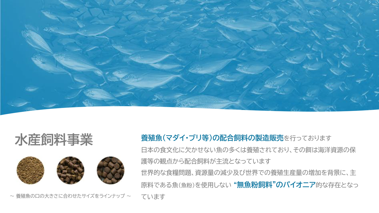 窪田:水産飼料事業は今後、非常に大きな成長が期待されています。昨今のニュースでもよく取り上げられていますが、陸上養殖や沖合での大規模な養殖といった新たなビジネスが台頭していますので、成長の可能性があると考えています。