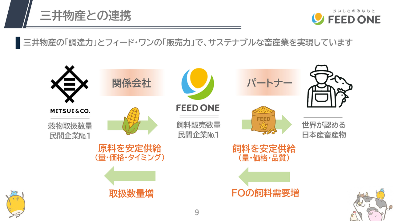 三井物産による原料の安定供給により私たちは製造・販売・研究に注力することができ、飼料販売量が伸び、それにより三井物産のとうもろこしの取扱量が増えることになり、両社はWIN-WINの関係となっています。