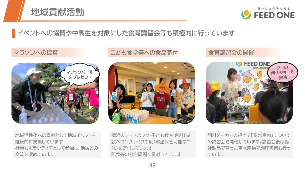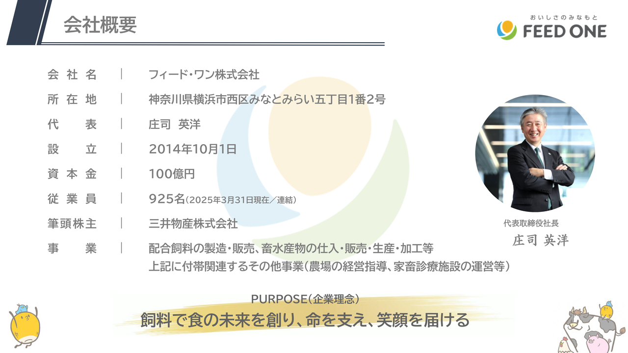 恐らく配合飼料業界は馴染みがなく、フィード・ワンという会社名もご存じない方も多いと思います。今日の説明会でみなさまのご理解が進み、今後の投資判断の材料となれば幸いです。