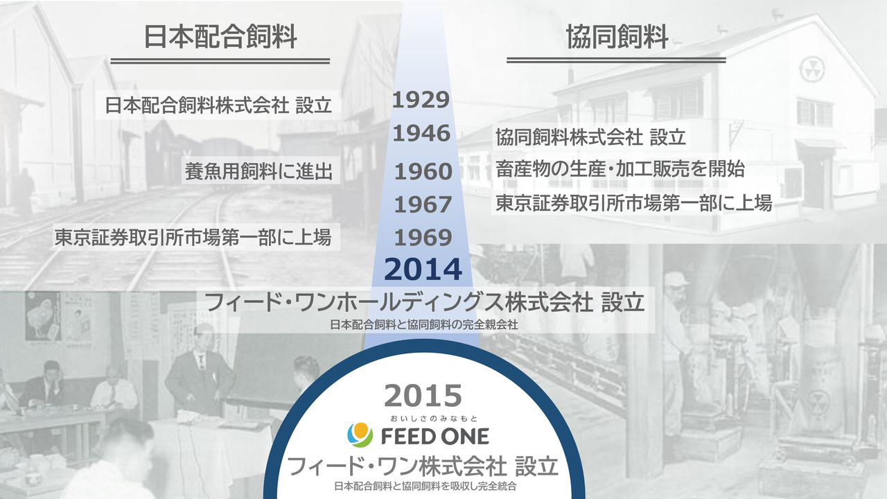 横浜に本社を置く上場企業であった日本配合飼料株式会社と協同飼料株式会社が2014年に経営統合し、翌2015年に完全統合して現在の会社となりました。統合前は、それぞれ民間企業として業界第4位と第5位でした。