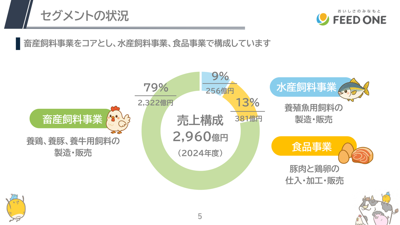 セグメントの状況ですが、主力事業は畜産飼料事業で売上高の約8割を占めており、同じ飼料事業である水産飼料事業と、豚肉・鶏卵の仕入・加工・販売をしている食品事業の3つのセグメントとなっています。
