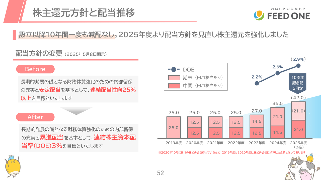 株主還元方針は昨年見直し、従来の「配当性向25パーセント以上」から、「DOE3パーセントを目標とした累進配当」へ方針変更しました。
