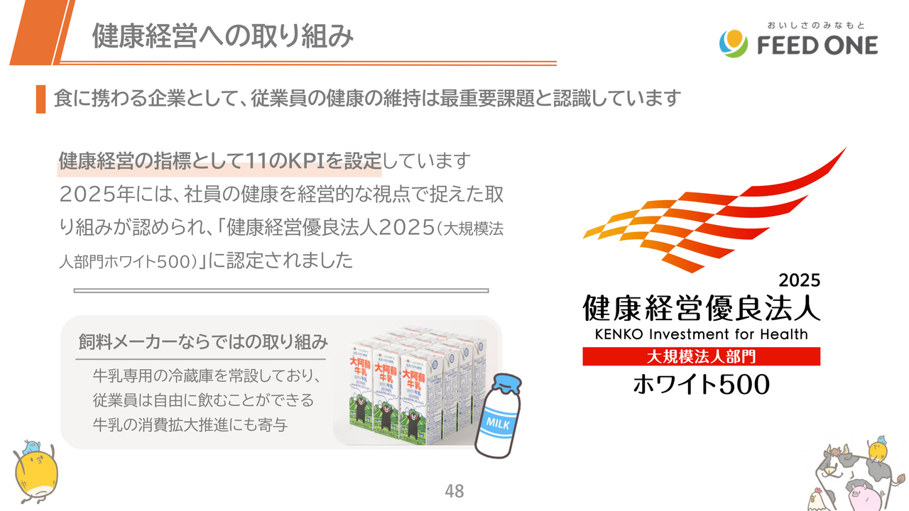 東京証券取引所に上場する食品セクターに属する企業は130社、そのうち23社だけがホワイト500に認定される狭き門ですので、この認定は誇らしく思っています。