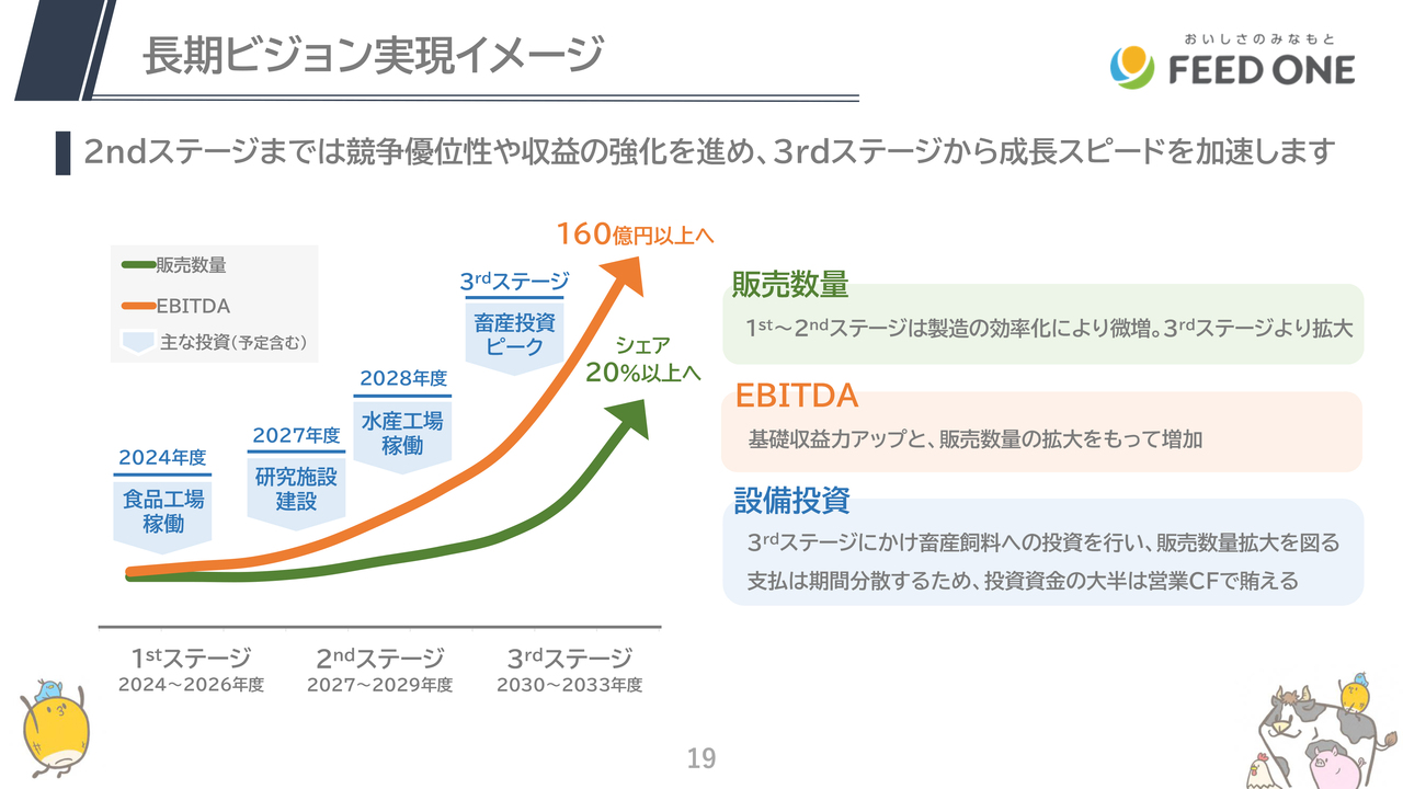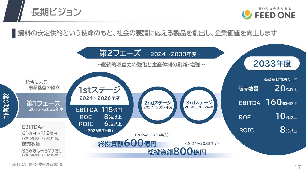 2024年度からの10年間を第2フェーズとし、収益力強化と飼料工場を中心とした積極的な投資により、2033年度には販売数量は業界シェア20パーセント以上、EBITDAは160億円以上、配合飼料業界での真のリーディングカンパニーを目指します。