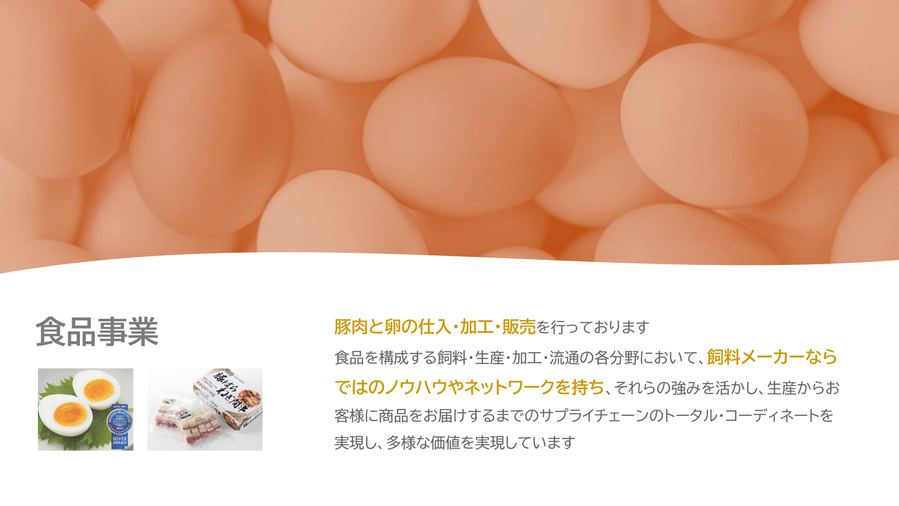 当社の食品事業は、豚肉と卵の仕入・加工・販売です。