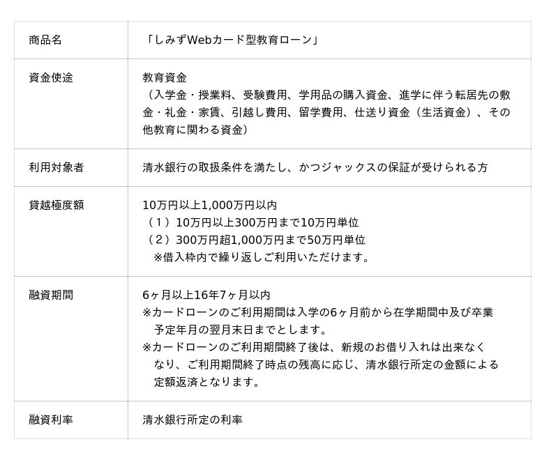 このたび、取り扱いを開始する「しみずWebカード型教育ローン」は、入学金や授業料などの学費のほか、家賃や仕送り資金など様々な用途でご利用いただけます。また、契約書の記入が不要であり、Webサイト上で審査のお申し込みから契約締結までの手続きをペーパーレスで完結できます。加えて、お申し込み受付は24時間365日対応しており、実店舗への来店も不要なためお客様の利便性向上及び迅速な融資が可能となります。