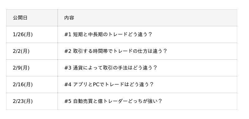 FXでは、取引時間、通貨ペア、裁量取引と自動売買といった取引方法など、取引における選択肢が数多く存在することから、「どの手法で取引すればいいのかわからない」という初心者の声をよく耳にします。そこで本番組では、FX初心者の持つ“FXの疑問“に焦点をあて、5つのトレード手法を取り上げます。