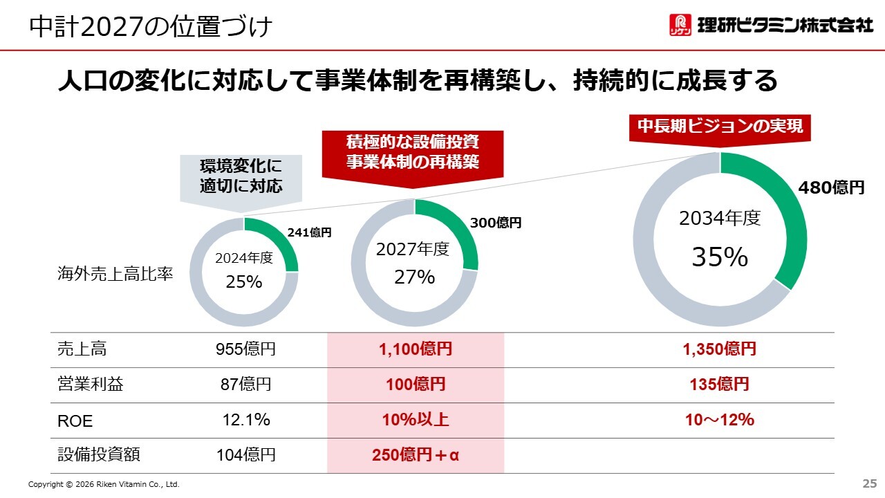 当社グループは、10年後の2035年3月期に売上高1,350億円、営業利益率10パーセント、ROE10パーセントから12パーセント、海外売上高比率35パーセントとする目標を掲げています。そのプロセスの1つとして、2028年3月期をゴールとする3年間の「中計2027」を現在進めています。