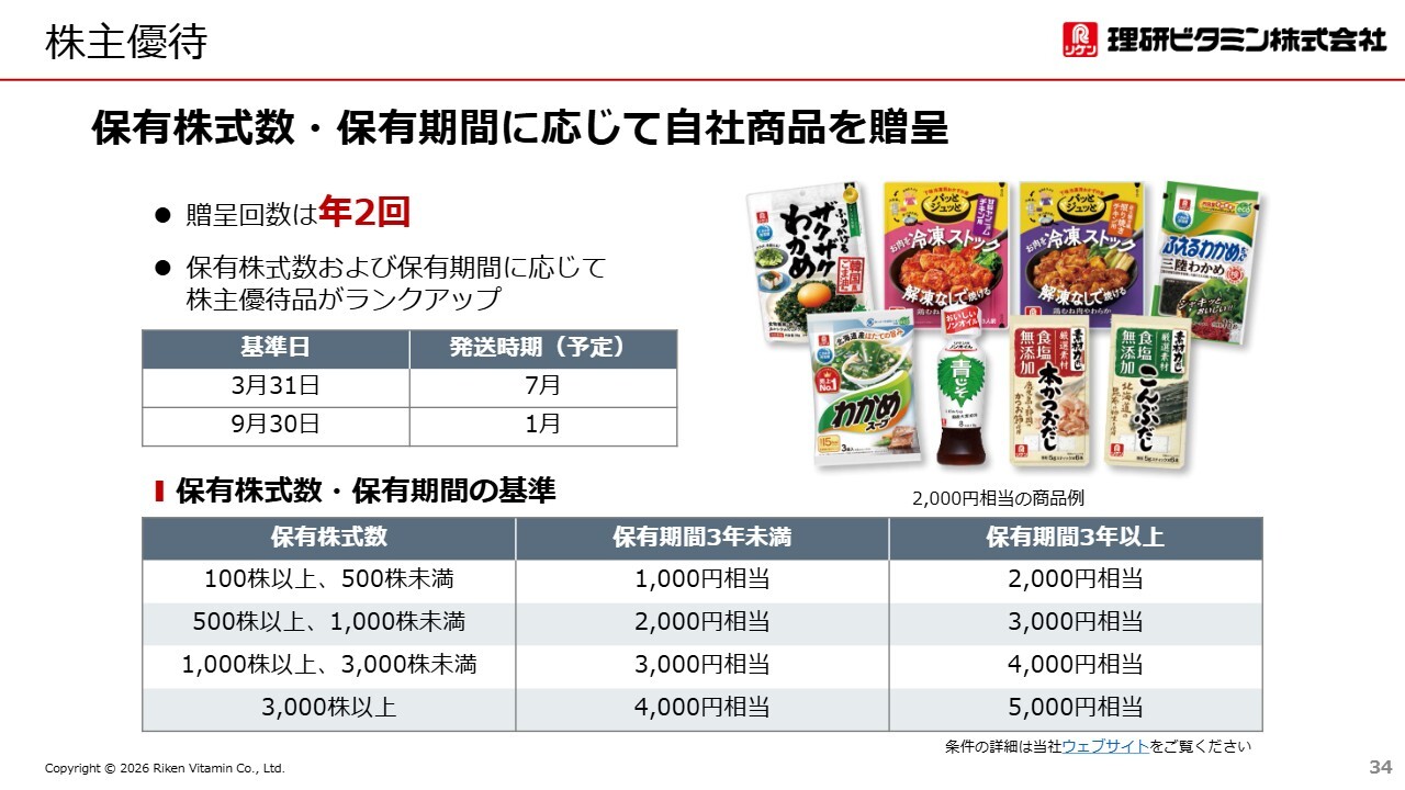 井上:そうです。少し説明させていただくと、こちらが今年1月に株主のみなさまにお送りした1,000円相当の株主優待品です。スライドの写真は2,000円相当のため、若干豪華です。当社の株主優待の大きな特徴は、年2回お届けしている点です。3月末、9月末の保有株式数と保有期間によってお送りしています。件数が増えすぎたため、これまでより送付時期が若干遅くなってしまっています。