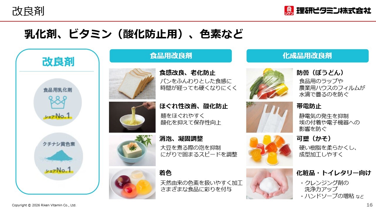 井上:改良剤についてご説明します。当社では、乳化剤や色素など、食品に添加することで機能を付与する加工食品原料を総称して、改良剤と呼んでいます。食品用の乳化剤とクチナシの黄色色素において、当社は市場シェアトップを誇っています。