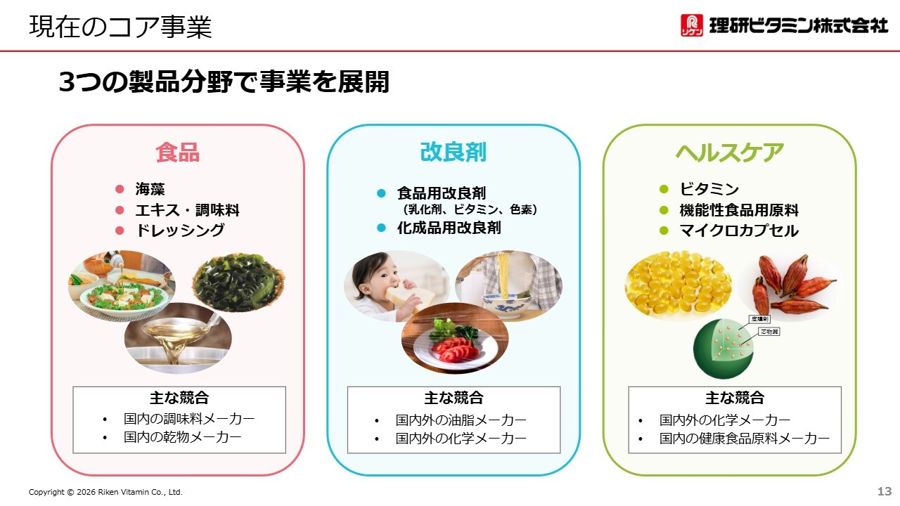 井上:現在のコア事業についてです。スライドのとおり、当社は食品・改良剤・ヘルスケアの3つの分野で事業を展開しています。競合についてよく質問されますが、非常に多岐にわたり、それぞれの分野で競合が存在します。ただし、真正面から競合する企業はそれほど多くなく、うまくすみ分けを図っていると考えています。