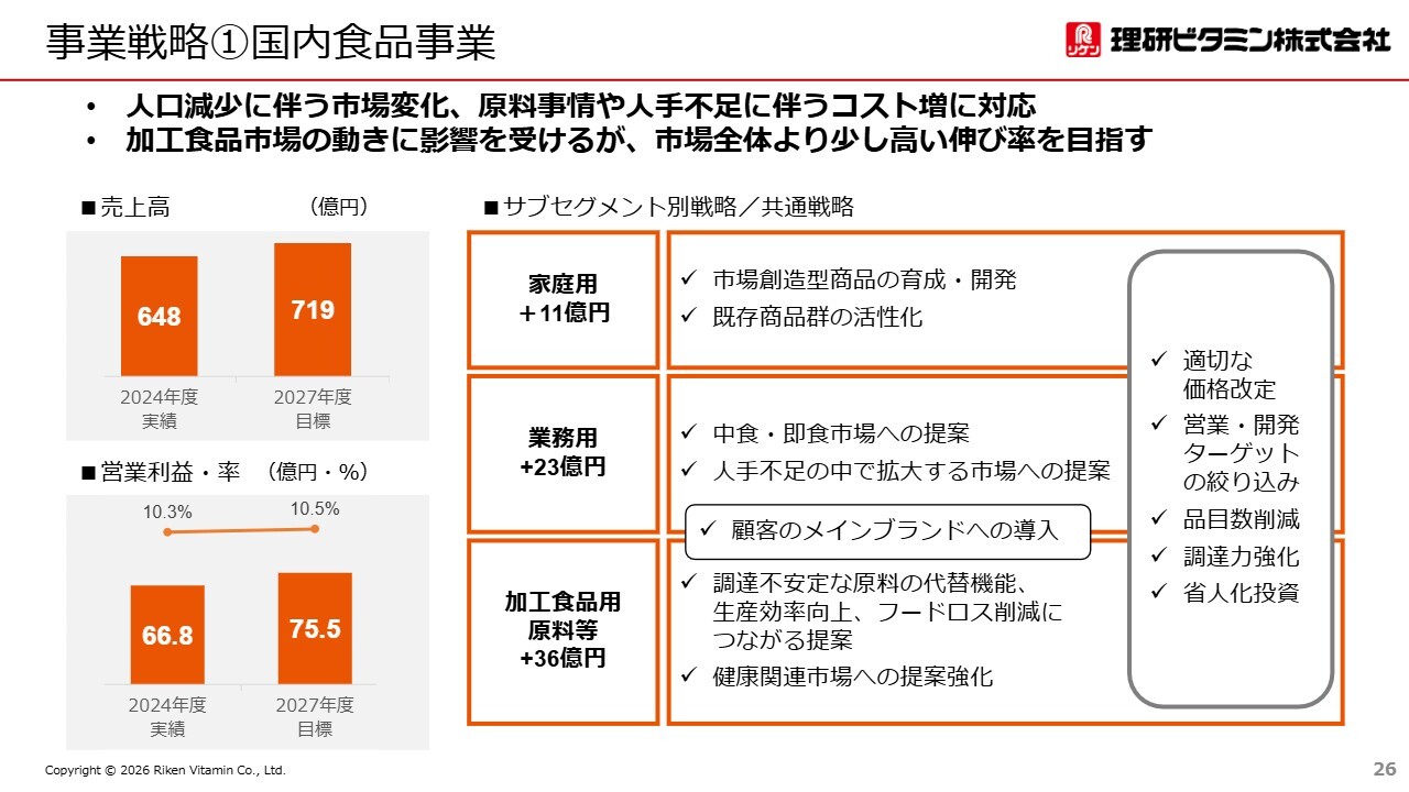 まず、国内食品事業です。ご存じのとおり、国内では人口減少が進んでおり、市場の変化や原料事情など、非常に厳しい課題があります。しかしながら、それらにしっかりと対応することで、加工食品市場全体を上回る成長率を目指していきます。