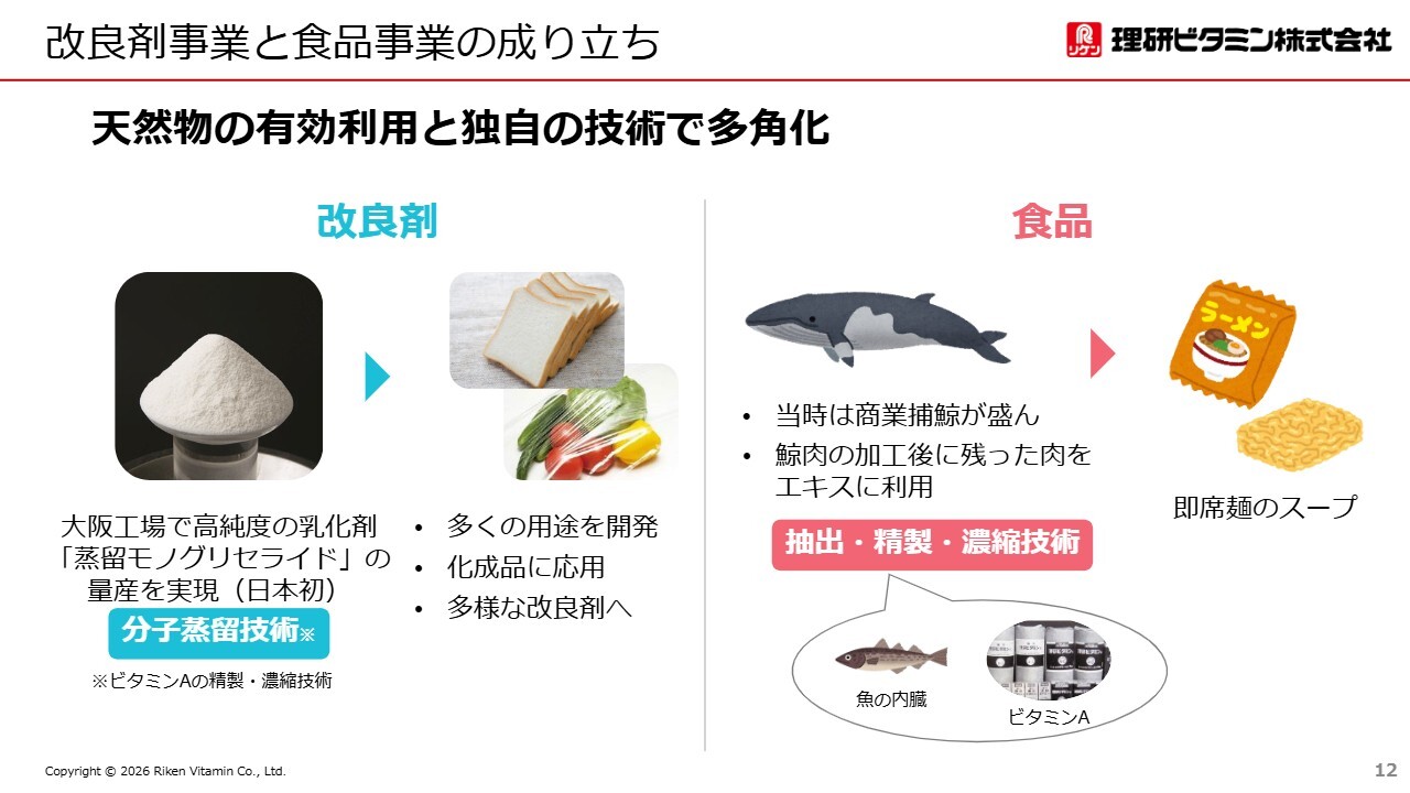 井上:そこで生まれたのが、現在に続く改良剤と食品です。改良剤事業は、ビタミンAを製造する際に用いる分子蒸留技術を活用し、スライドに記載の「蒸留モノグリセライド」という高純度の乳化剤を日本で初めて量産したことから始まりました。
