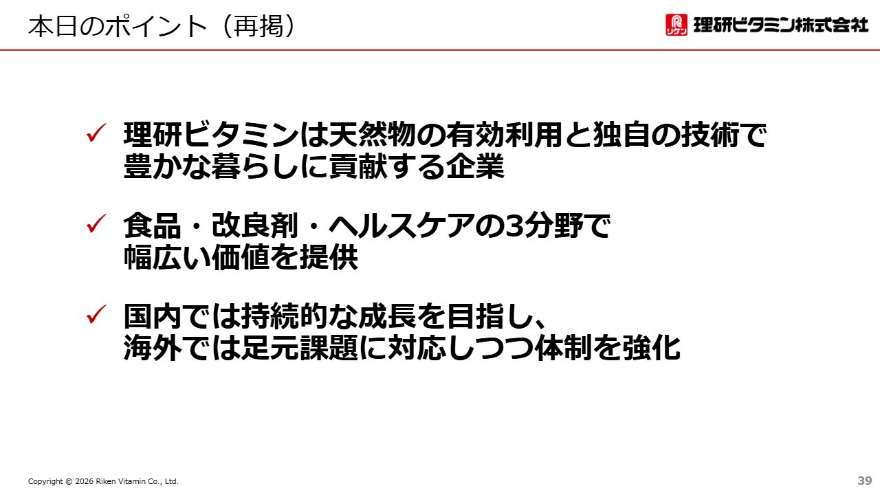 井上:最後に、本日のポイントをあらためてお示しします。当社はスライドの3つのポイントを持った、非常にユニークな会社だと考えています。引き続き、ご興味を持っていただけるとうれしいです。ご不明な点はご質問ください。