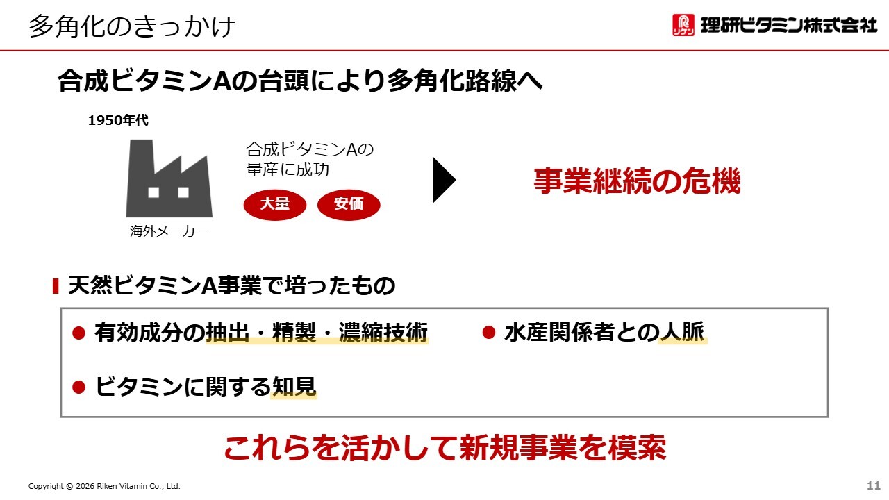 井上:当社の歴史とコア事業についてご説明します。当社は、理化学研究所のビタミン研究室をルーツとしています。戦前、理化学研究所は自らの研究資金を捻出するために、多くの会社を作って研究資金を稼いでいました。