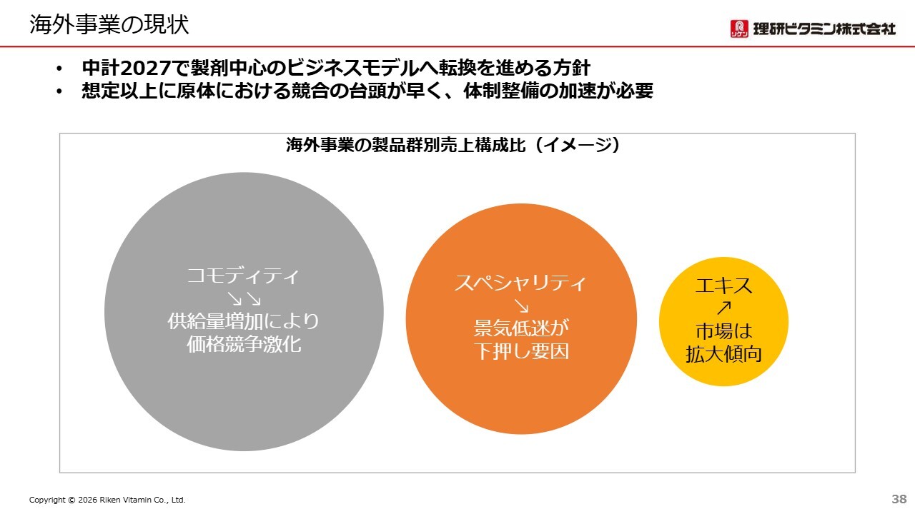 井上:海外事業の現状については先ほどご説明したので、簡単にお話しします。コモディティ品については、ボリュームは大きいものの、供給量の増加による価格競争の激化で苦戦しています。スペシャリティ品についても、景気低迷の影響を受けて若干下振れしています。一方、アメリカのポークエキスに関しては、ラーメンスープ市場が拡大していると認識しており、成長の余地があると考えています。