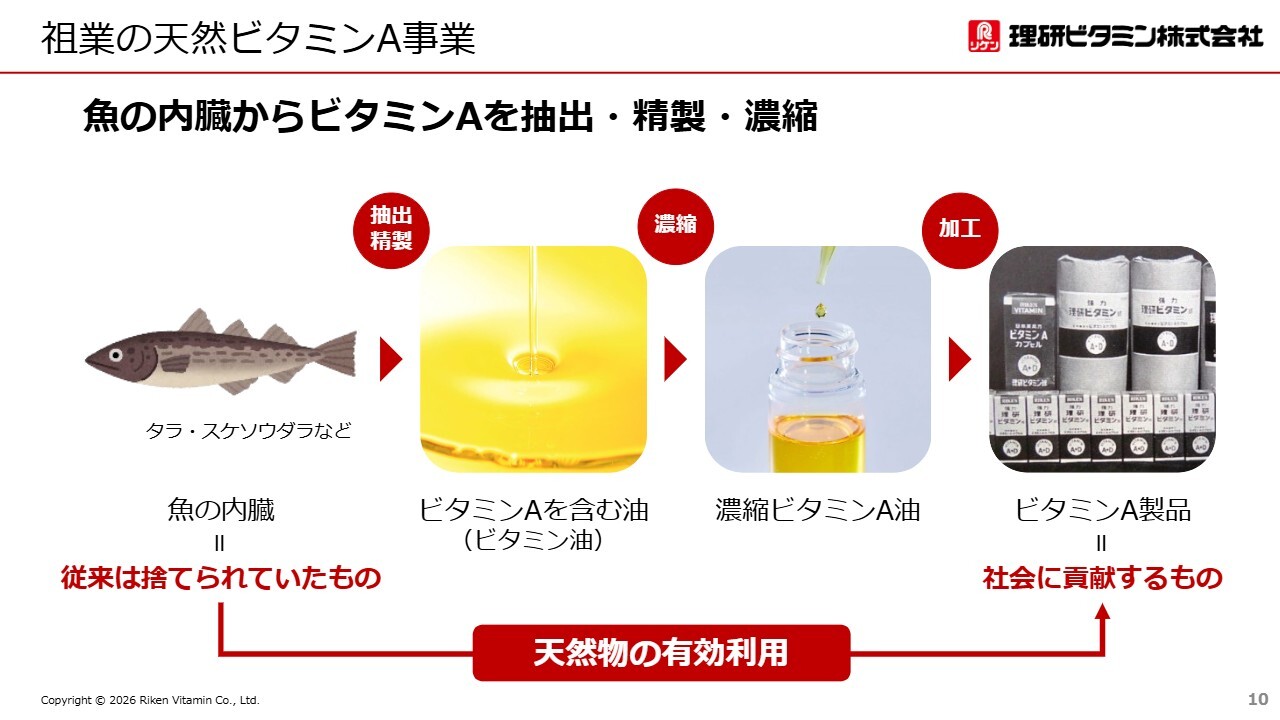 そのため、創業者たちは全国の魚市場を回り、捨てられる魚の内臓や肝臓を回収して、そこからビタミンAを含む肝油を抽出し販売していました。この祖業が、当社の理念を形成しています。すなわち、捨てられていた天然物を「もったいない」と活かし、社会に貢献するものを作るという理念です。